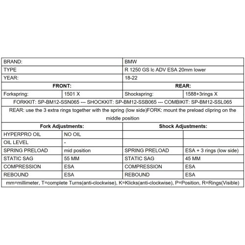Tieferlegungssatz -20mm perfekt auf die original Federbeine der BMW R1250GS Adventure abgestimmt. Durch diesen Federnsatz erzielen Sie eine sinnvolle Tieferlegung um -20mm bei gleichbleibend guten Fahreigenschaften natürlich geht etwas Bodenfreiheit verloren. Die progressiven Federn sind perfekt auf die original Federbeine der BMW R1250GS Adventure abgestimmt. Das Fahrwerk bietet nach dem Umbau weiterhin ein gutes Ansprechverhalten und hohe Sicherheit im Grenzbereich. Durch den Austausch der Federn vorne und hinten bleibt die Balance Ihres Motorrades erhalten.
