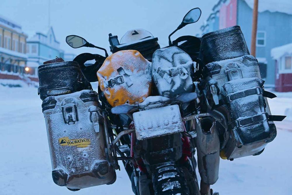 Im Januar 2025 war es dann wieder soweit. Eigentlich. Das Problem dieses Mal: Martin konnte sein Motorrad nicht nach Kanada importieren. Die Tour stand wieder am Rande einer weiteren Verschiebung. Doch Alex und Martin hatten Glück. BMW Motorrad Kanada stellte zwei F 900 GS für die Tour zur Verfügung und Touratech erklärte sich bereit, die Ausstattung beizusteuern. Am 17. Januar 2025 starteten die beiden Abenteurer auf eisigen Straßen. Nach Fahrtagen bei bis zu minus 37 Grad Celsius, einem Plattfuß, Begegnungen mit Elch und Büffel, Glatteis, Blizzardwarnungen und Straßensperrungen standen Alex und Martin am 9. Februar schließlich vor dem berühmten Schild am arktischen Meer in Tuktoyaktuk.