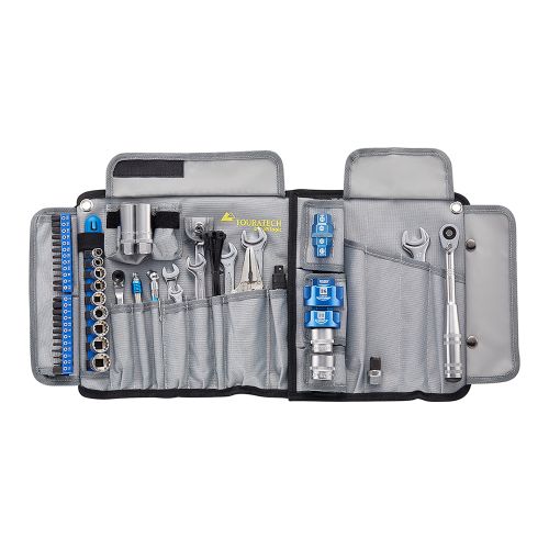 Die solide Doppelschicht-Rolltasche mit nur 2,5 kg Gewicht wartet mit einem professionellen Motorrad Werkzeug Set auf, das aus besten Materialien gefertigt ist: die S2-Bits mit schwarzem Phosphat-Rostschutz. Sockel und Schraubenschlüssel sind Cr-V satinverchromt. Mit ihren kompakten Abmessungen findet diese Motorrad Werkzeugtasche im Touratech-Design immer einen Platz auf Ihrem Bike.