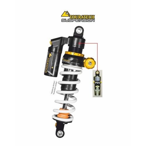 Beim Touratech Suspension Extreme-Federbein handelt es sich um die absolute Premiumklasse in Sachen Fahrwerkstechnik. Dieses Extreme-Federbein für die KTM790 Adventure R ist perfekt für den Touren- und Fahrbetrieb mit häufig und stark wechselnden Beladungs- und Fahrzuständen oder extremste Anforderungen entwickelt. So ist beim Extreme-Federbein das PDS verbaut, ein hydraulischer Durchschlagschutz durch Verwendung eines zweiten Dämpferkolbens. Selbst bei extremsten Pistenverhältnissen mit vollem Reisegepäck kommt es zu keinem Durchschlagen, eine mechanische Überlastung des Federbeins wird verhindert. Die Dämpfung arbeitet wegabhängig. Im überwiegenden Fahrbetrieb ist das Federbein komfortabel und kräfteschonend justiert, bevor im letzten Teil des Federbeinhubs das PDS eingreift.